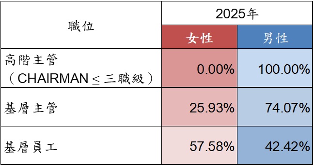 員工結構 敦吉於人員招募上,依循公司政策及相關法令規定,除秉持公平客觀之精神,評估求職者之綜合表現外,並重視人才選任多元性原則並兼顧性別平等議題,確保就業機會平等。 在勞動權益(例如:薪酬福利、培訓機會、升遷等)事項上,確保員工不會因種族、性別、宗教信仰、年齡、政治傾向及其他受適用法規保護的任何其他狀況而有不公平的對待。